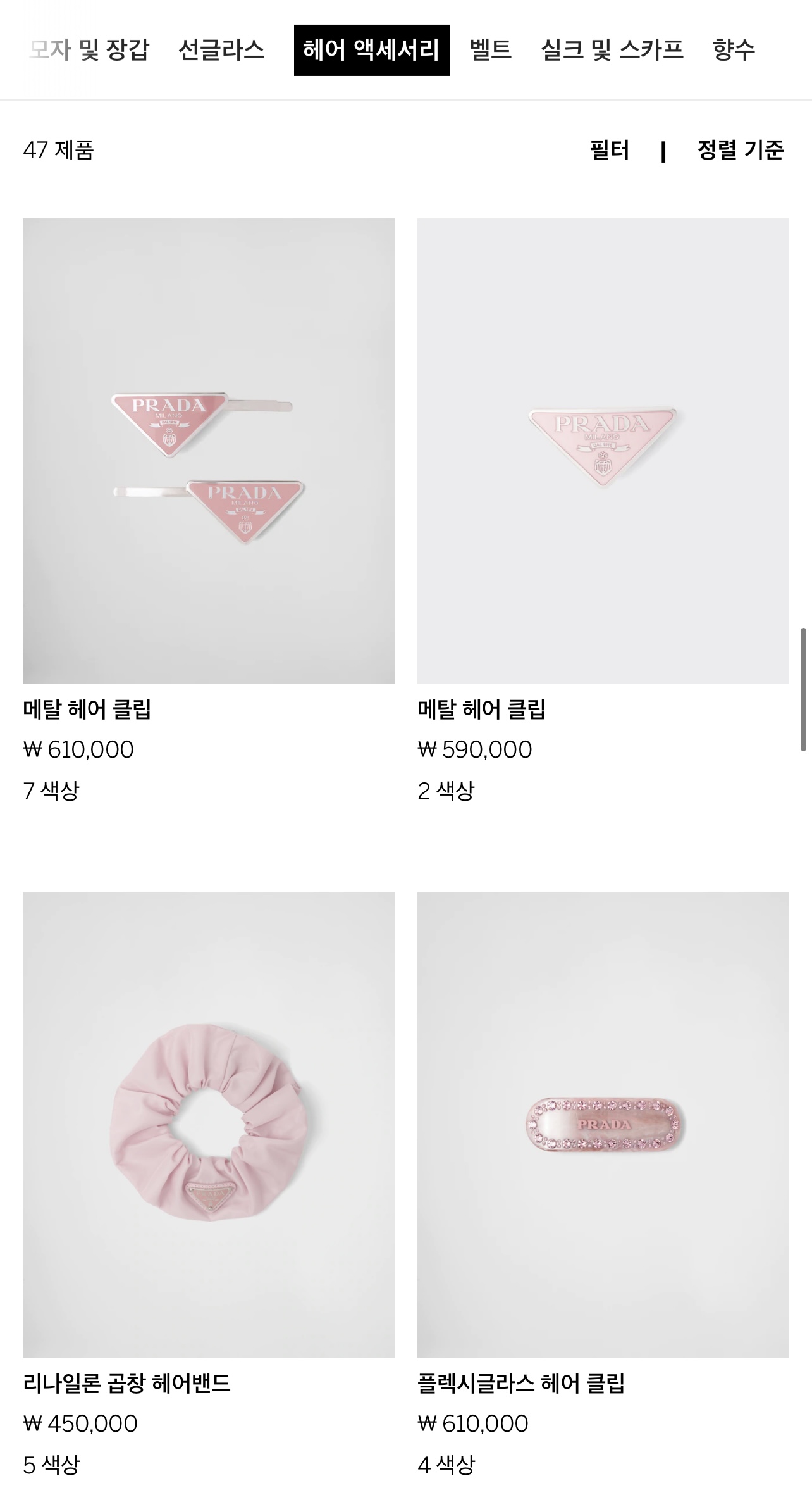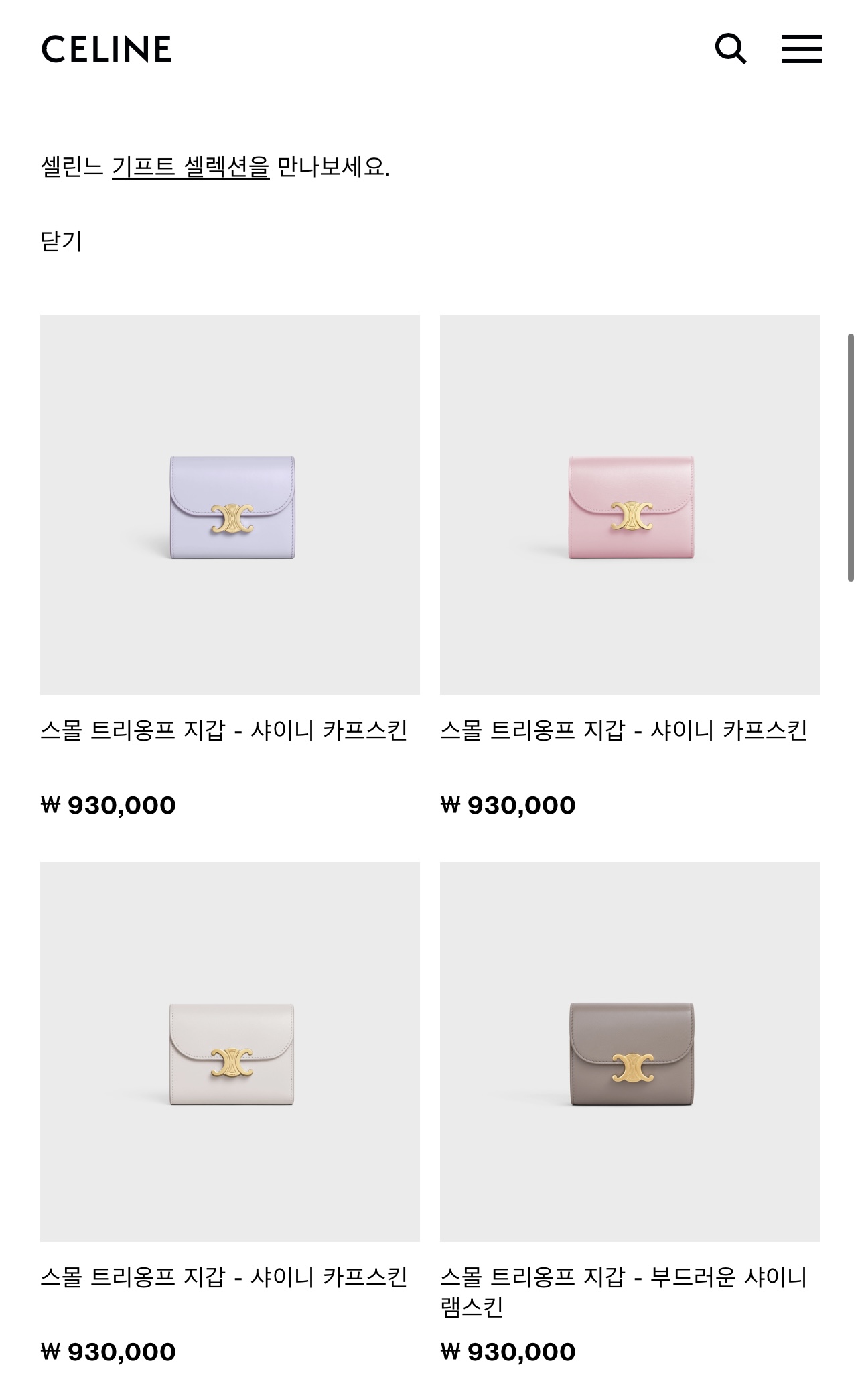 이번 시즌 프라다는 많은 사람들이 열광할 정도로 예쁜 아이템들이 많은데요. 곱창 헤어밴드나 헤어악세사리 들이 특히 인기입니다. 내돈내산 하기는 손 떨릴 수 있는 가격인데 선물로 받으면 기분이 매우 좋을것 같습니다. 셀린느의 진주 귀걸이나 컬러풀한 지갑들도 보기만 해도 설레는 아이템인데요. 이번 시즌에만 나올것 같은 핑크색이나 연보라색 지갑도 너무 예쁘네요.