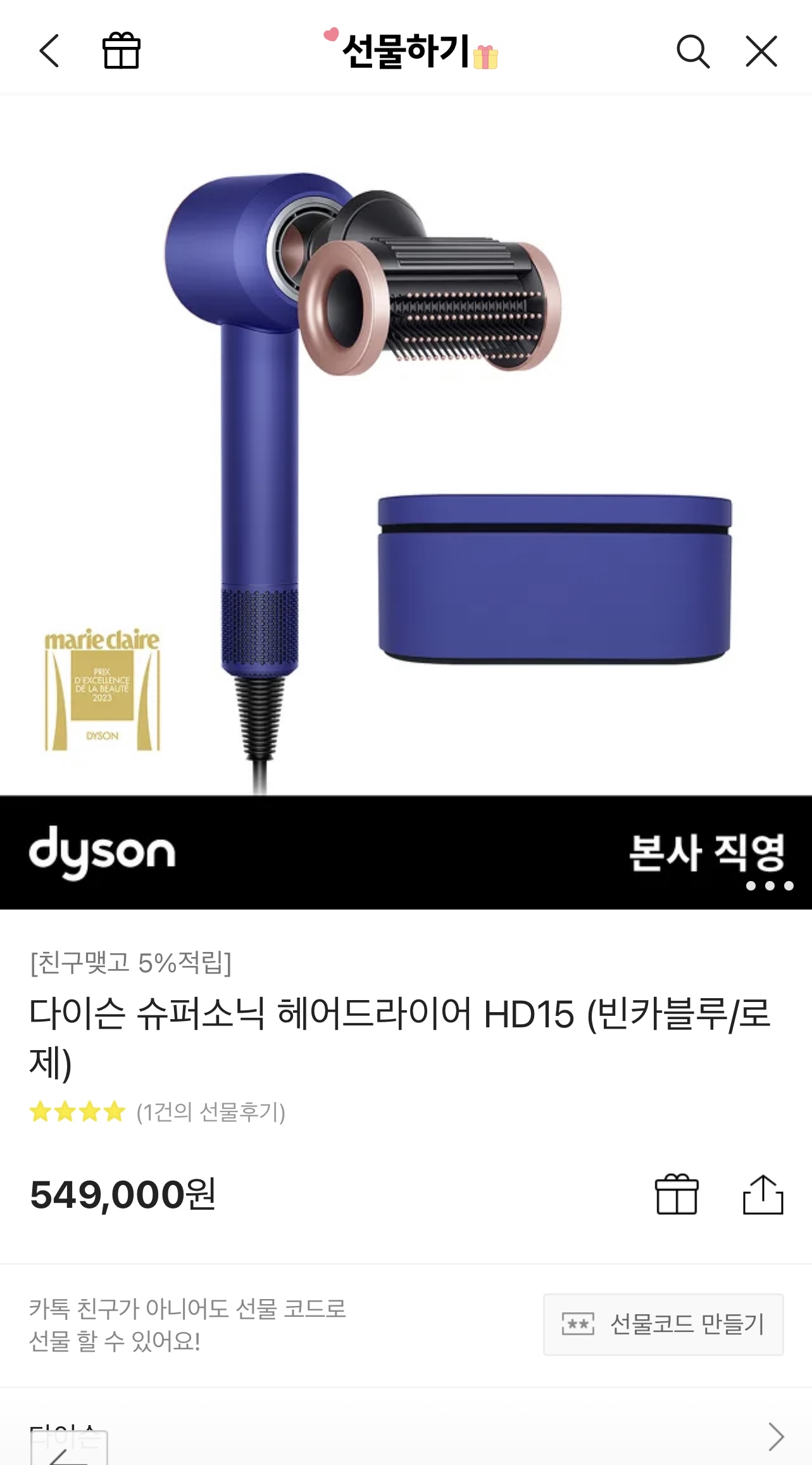 값비싼 아이템을 선물해주려고 한다며 헤어기기를 추천드립니다. 헤어기기중에서 단연코 베스트는 다이슨 제품이라고 생각합니다. 다이슨 드라이기나 스타일러는 일단 한번 써보면 다들 비싸도 사길 잘했다고 강추하는 제품입니다. 전문가가 아니여도 머리를 손질하는 것을 쉽게 하도록 도와주고 헤어 손상도 적은 편입니다.