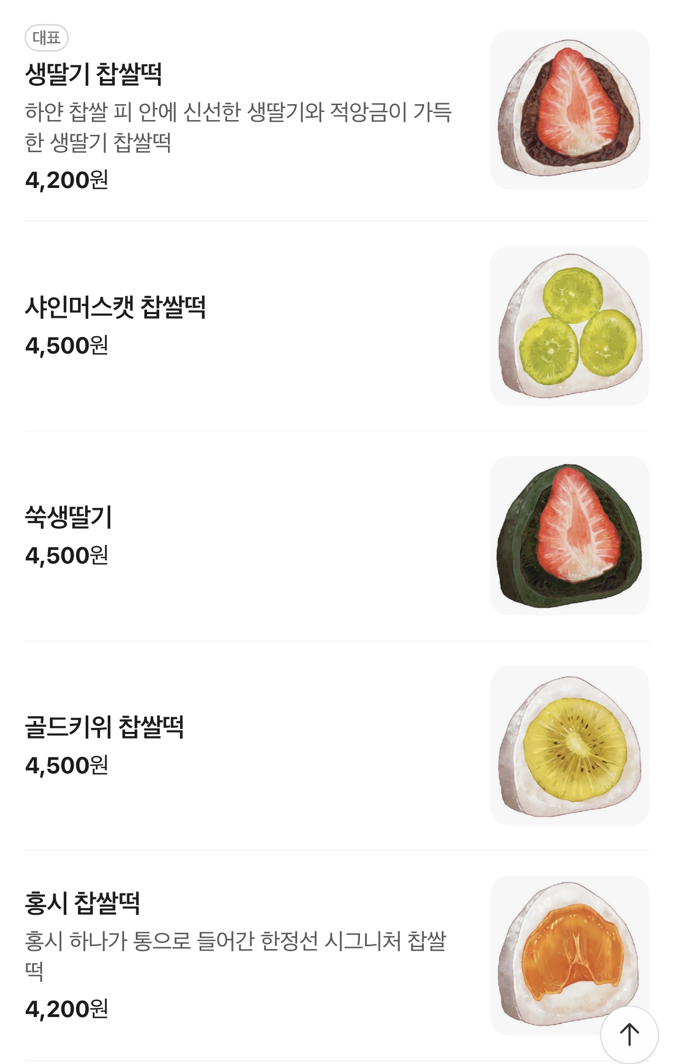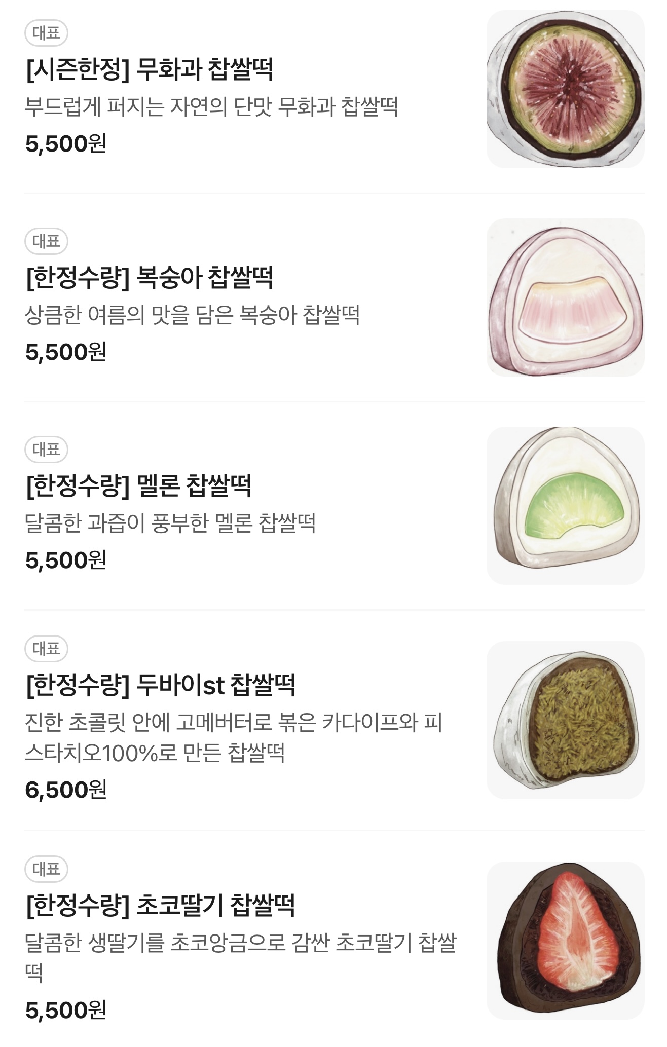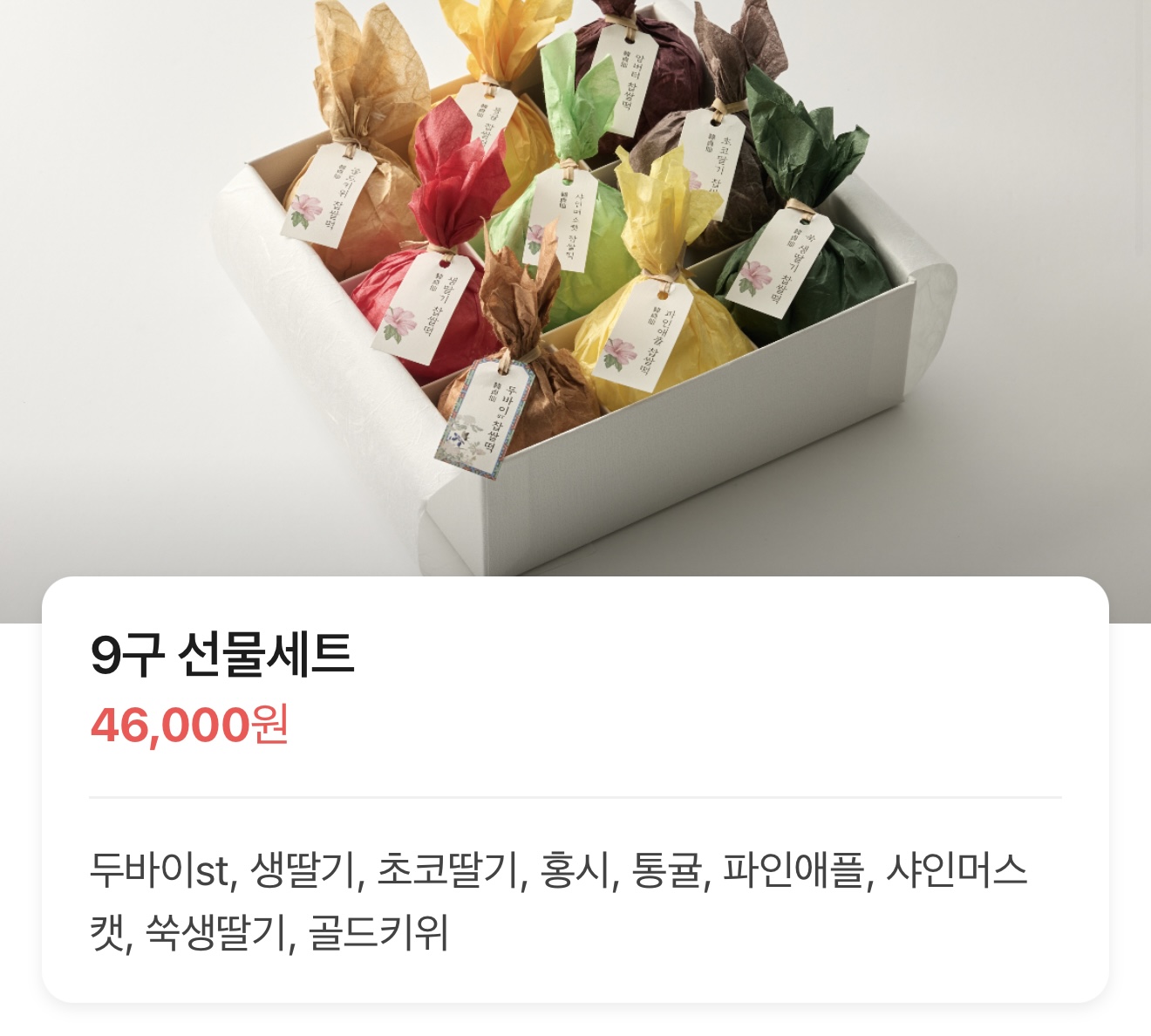 마지막으로 추천해드릴 선물 아이템은 한정선의 과일모찌 입니다. 예전부터 과일모찌는 많이 판매하였는데요. 한정선 제품이 과일의 종류가 계절별로 다양하고, 종류도 많고 맛이 있어서 인기가 좋습니다. 종류는 때마다 다르지만 대략 아래와 같고 선물세트로도 구매가 가능합니다. 찹쌀모찌는 팥으로만 주로 드시던 어른들께 과일모찌를 선물해드리면 새로운 맛을 경험해보실 수 있을듯 합니다. 한정선은 성수본점을 필두로 최근 새롭게 오픈된 서울역점을 비롯해 더현대서울점, 신세계백화점 강남점, 현대백화점 무역센터점등에서 판매하고 있어 오프라인으로 구매가 가능합니다.