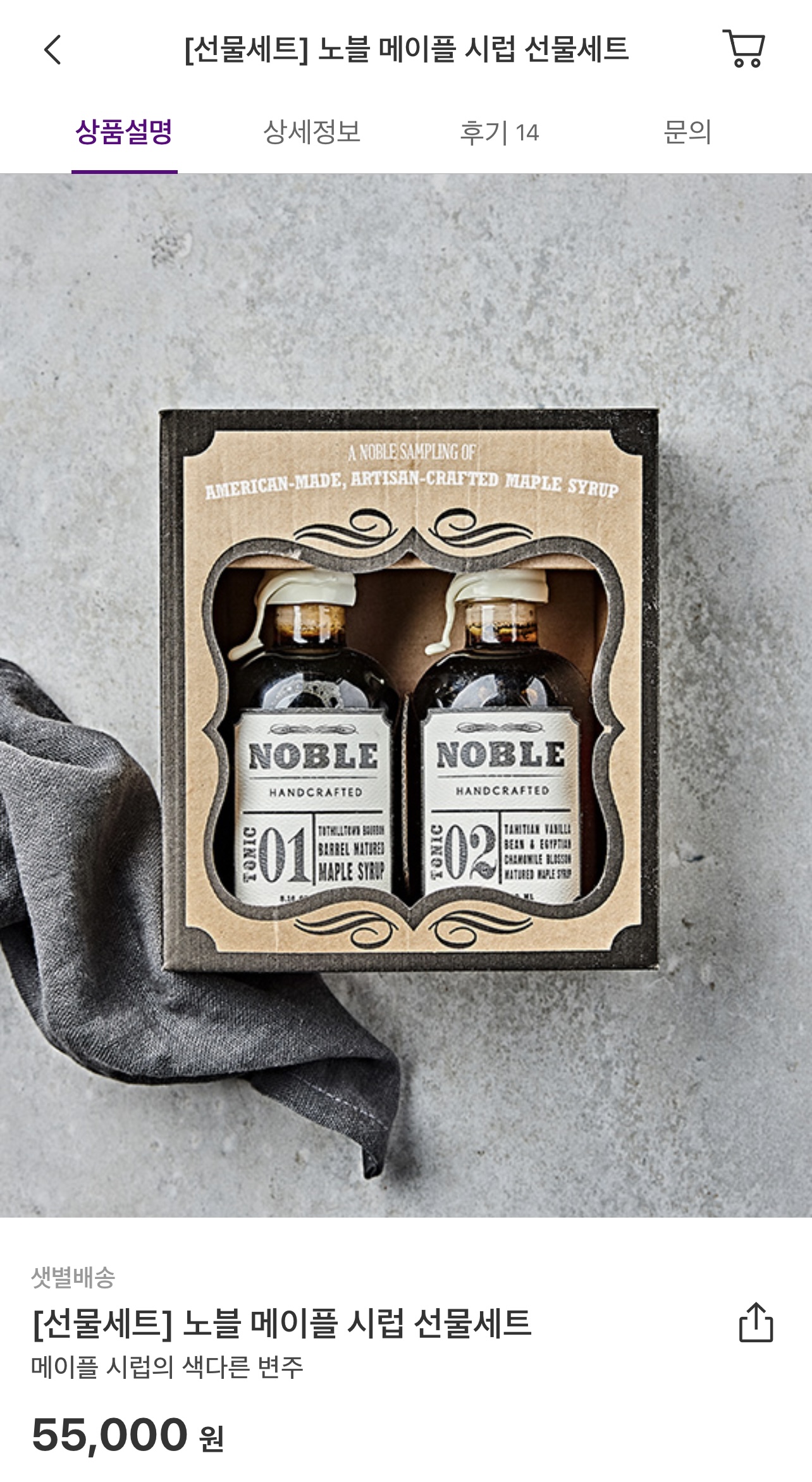 노블 메이블 시럽은 오크통에서 숙성된 시럽이라 풍미가 남다른데요. 브런치 드실때 팬케이크와 베이컨에 뿌려 드셔도 맛있고, 군고구마나 가래떡 인절미에 꿀대신 찍어드셔도 맛있는데요. 컬리에서는 토닉메이플 시럽과 토닉캐모마일과 바닐라를 넣은 메이플 시럽 두가지를 세트로 아래와 같이 박스에 넣어서 판매하기 때문에 선물하기 좋습니다.