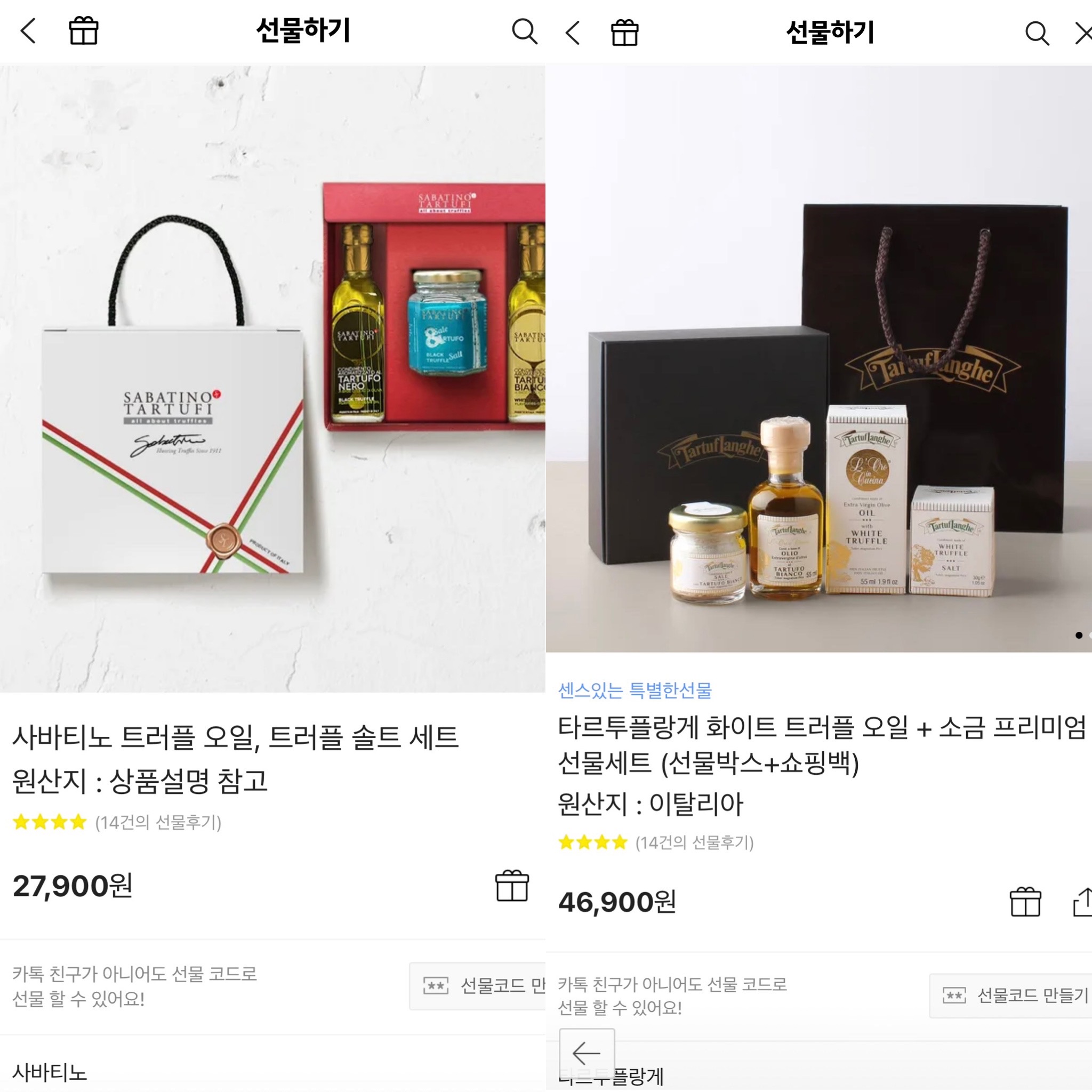 카카오톡 선물하기에는 유명 브랜드인 사바티노와 타르투플랑게 제품 모두 위와 같이 오일과 소금 세트 상품으로 구매할 수 있게 되어 있어서 이런 구성중에 생각하시는 가격에 맞는 제품으로 구매하시면 될 것 같습니다. 저는 선물하기를 좋아하고 이왕이면 기분 좋아지는 선물을 고르는걸 좋아하는 사람이여서 선물리스트 들을 찜해놓고 자주 살펴보는걸 좋아하는데요. 저의 추천템 리스트들이 도움이 되셨으면 좋겠습니다. 이외에도 본인만의 좋은 추천템이 있으시면 댓글로 알려주세요.