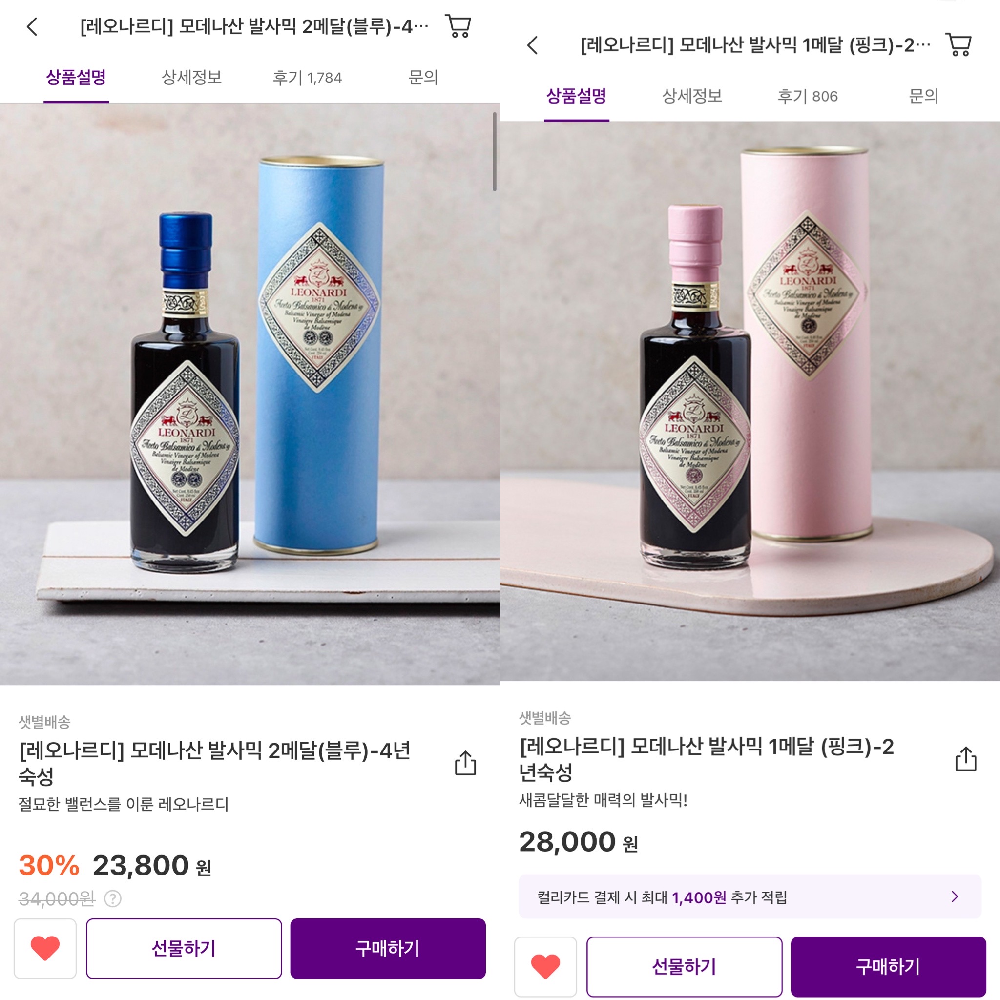 컬리에서 검색창에 선물 이라고만 쳐봐도 선물할 수 있는 아이템들을 바로 볼 수 있는데요. 5월이 되면 어버이날, 스승의날 때문에 선물용 아이템들을 할인가로 더 많이 올려놓을 거예요. 저의 첫번째 추천 선물 아이템은 레오나르디 발사믹 입니다. 제가 예전에 컬리에서 선물로 구매했을때는 올리브오일과 레오나르디 발사믹이 선물세트로 구성되어 있고 여러개를 구매할 경우 가격까지 할인을 해줘서 좋은 가격에 선물을 할 수 있었는데요, 지금은 그 구성이 보이지 않지만 일단 레오나르디 발사믹만 선물을 해도 괜찮은 아이템 입니다.