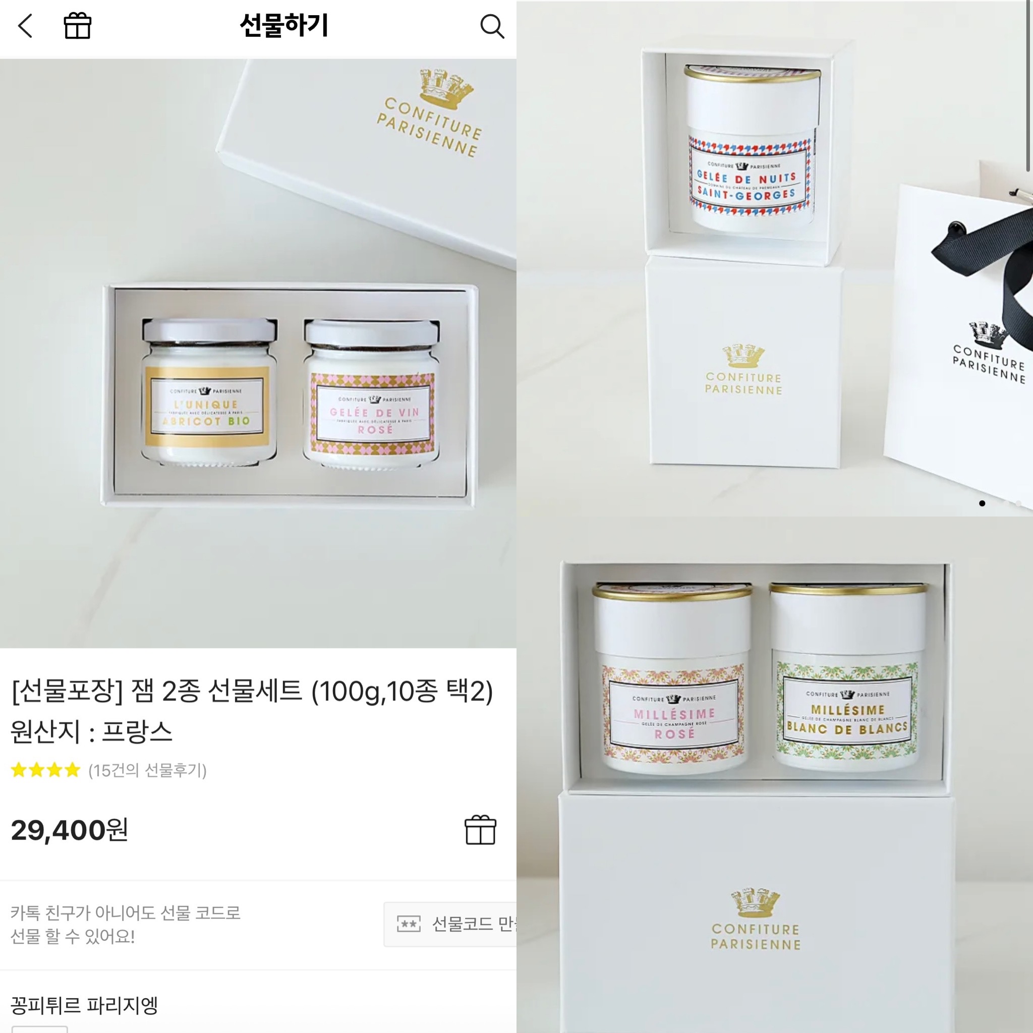 카카오톡 선물하기에서 추천드리는 첫번째 아이템은 꽁피튀르 파리지엥 잼 입니다. 꽁피튀르 파리지엥 잼은 파리에서 생산하는 유일함 잼으로 잼병도 예쁘고, 맛도 일반적인 딸기, 라즈베리 부터 얼그레이, 레드와인, 로제와인 등 다양합니다. 빵이나 비스킷에 발라먹어도 좋고 요리와 곁들여 먹어도 맛있습니다.