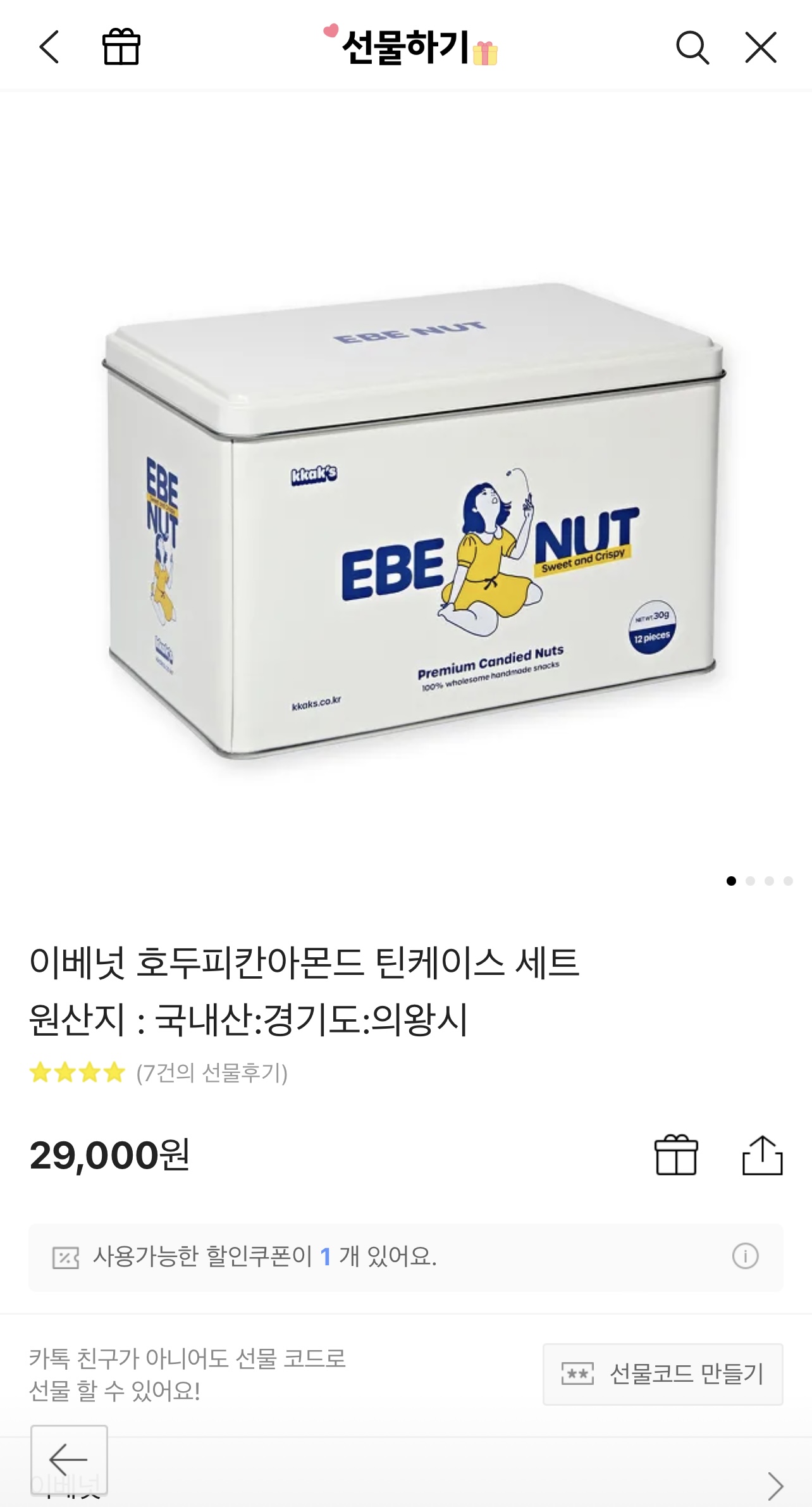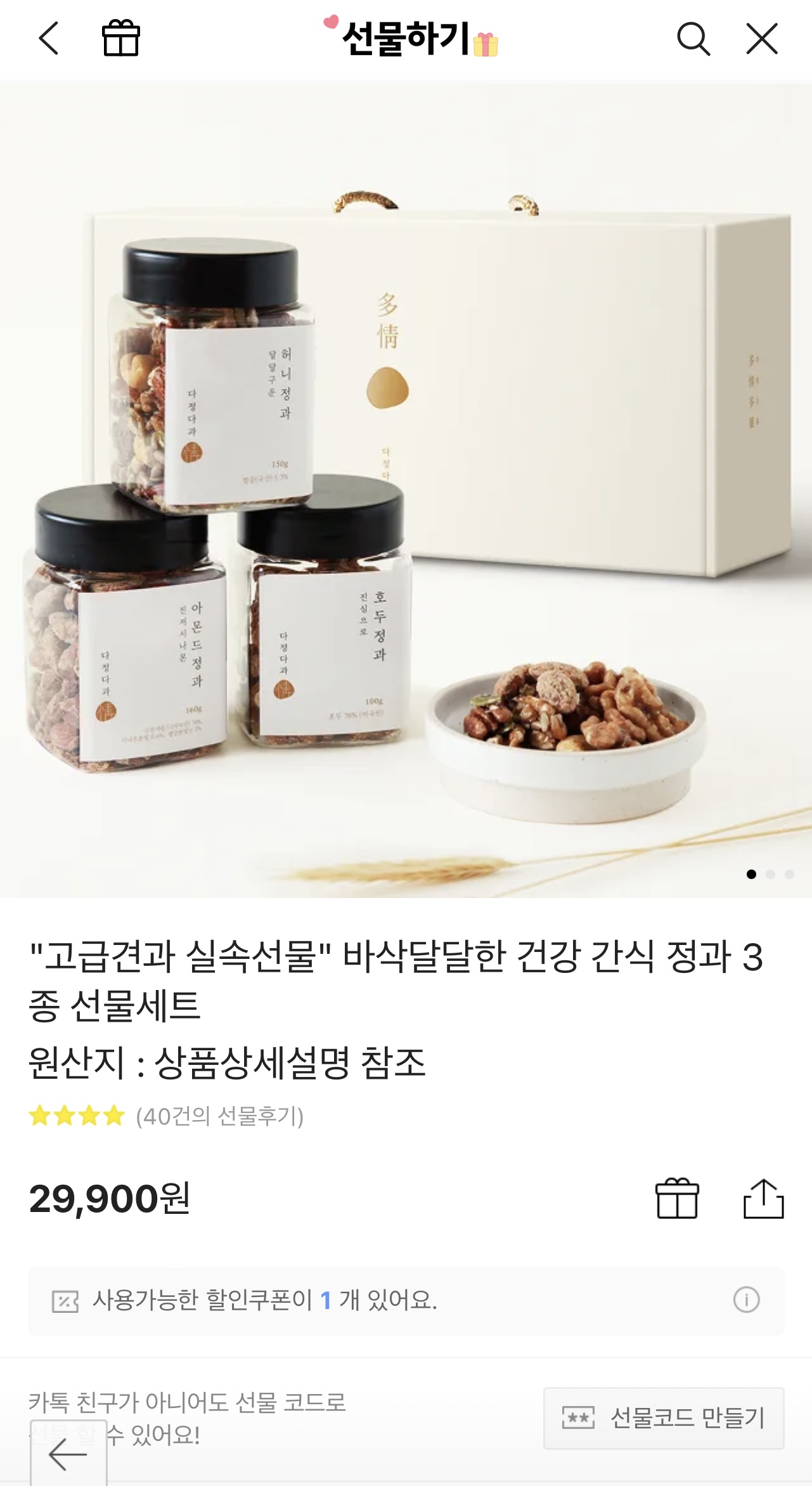 결국 먹거리 아이템이 또 나왔는데요. 견과류는 간식으로 드시기에도 건강도 챙길 수 있는 실속있는 먹거리여서 선물해드리면 부담스럽지 않은 아이템으로 추천드립니다.