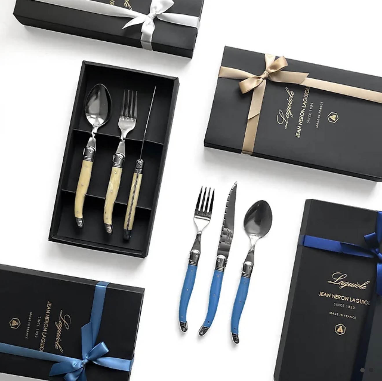 세번째 아이템은 제가 생일 선물이나 집들이 선물 혹은 신혼 부부들에게 가장 선물을 많이 했고, 저도 구매해서 쓰고 있는 아이템 인데요. 바로 장네론 라귀올 (Jean Neron Laguiole) 브랜드의 커트러리 입니다. 장네론 라귀올은 프랑스 남서부 지역에서 1899년에 설립된 장인 가문 브랜드로 현재 3대째 기술과 전통이 계승되어 오고 있는 브랜드입니다. 디테일이 있으면서도 일상적으로 편하게 사용할 수 있는 디자인으로 음식 플래이팅과 분위기를 살리기에 좋은 커트러리 입니다.