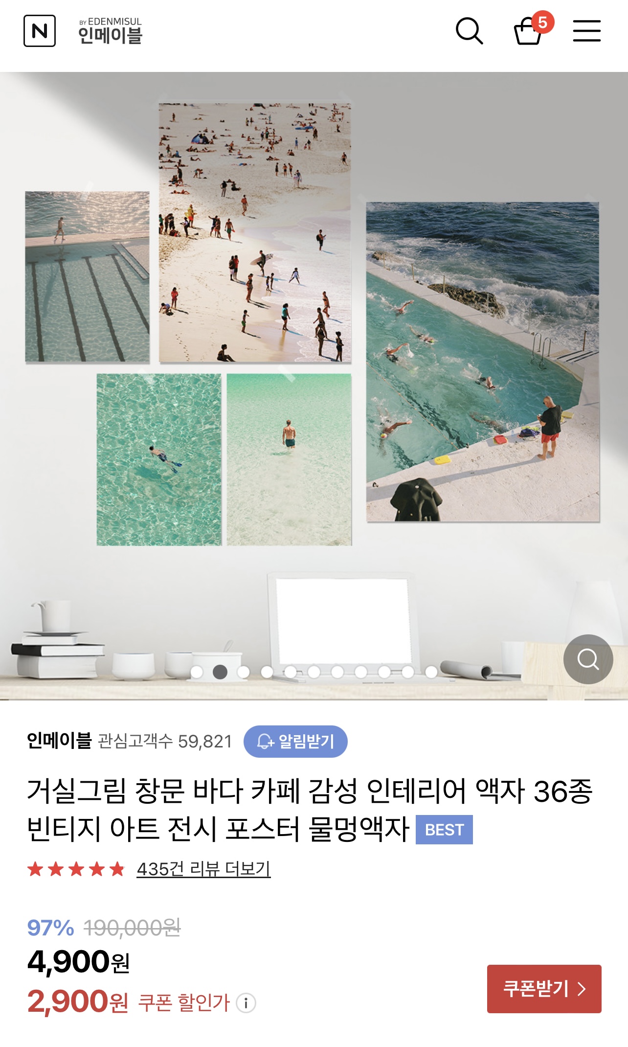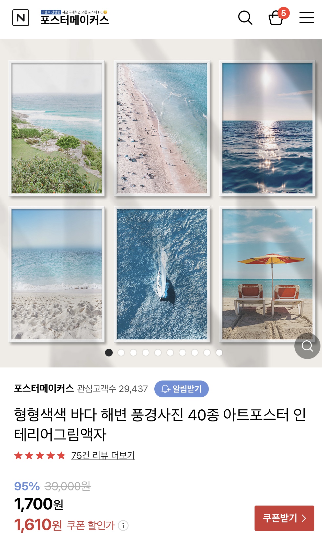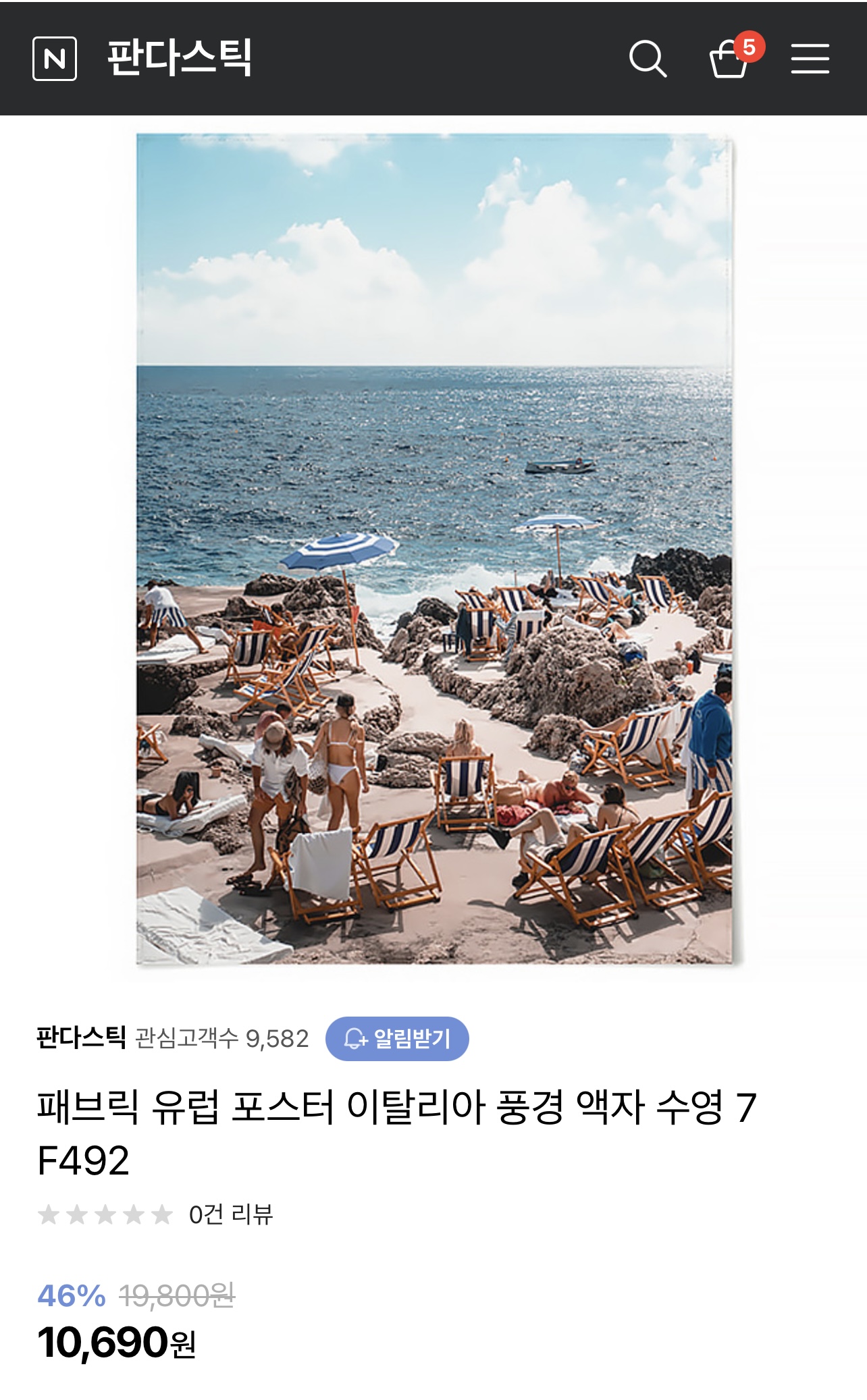 이 외에도 다양한 해변, 바다 사진중에서 골라보시고 싶으시면 인메이블, 판다스틱, 포스터메이커스에도 다양한 셀렉션들이 구비되어 있습니다. 저는 아래 그림 중 판다스틱의 이탈리아 풍경 해변 사진도 드레스룸에 걸어두었습니다.